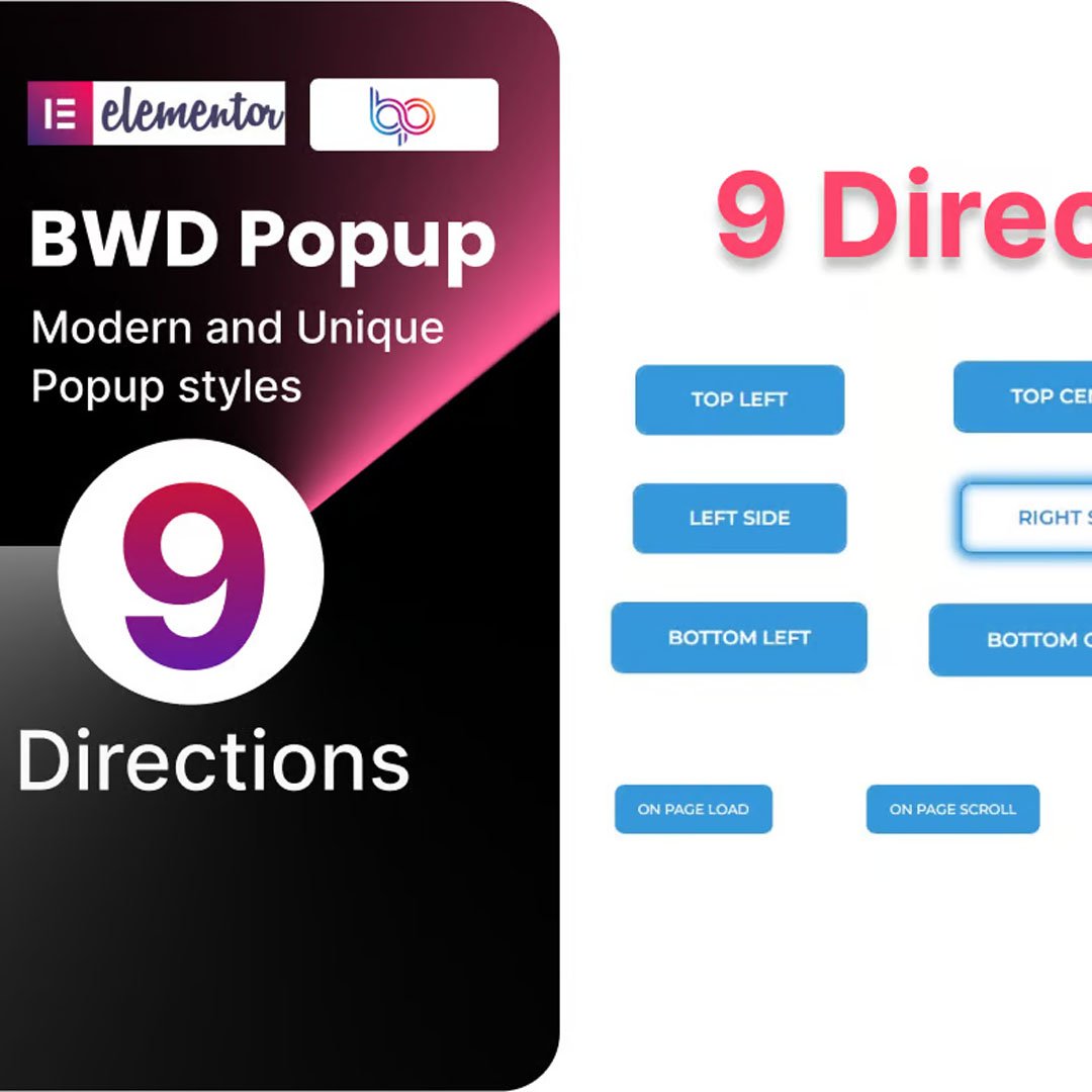 BWD Popup is a lightweight Elementor base WordPress plugin to add an attractive popup to your website without any coding knowledge. There are 9 directions and 4 conditional popup that looks awesome.